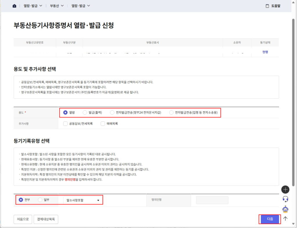 - 검색: 부동산 소재지번 검색결과에 나온 주소를 선택하여 다음 버튼 클릭