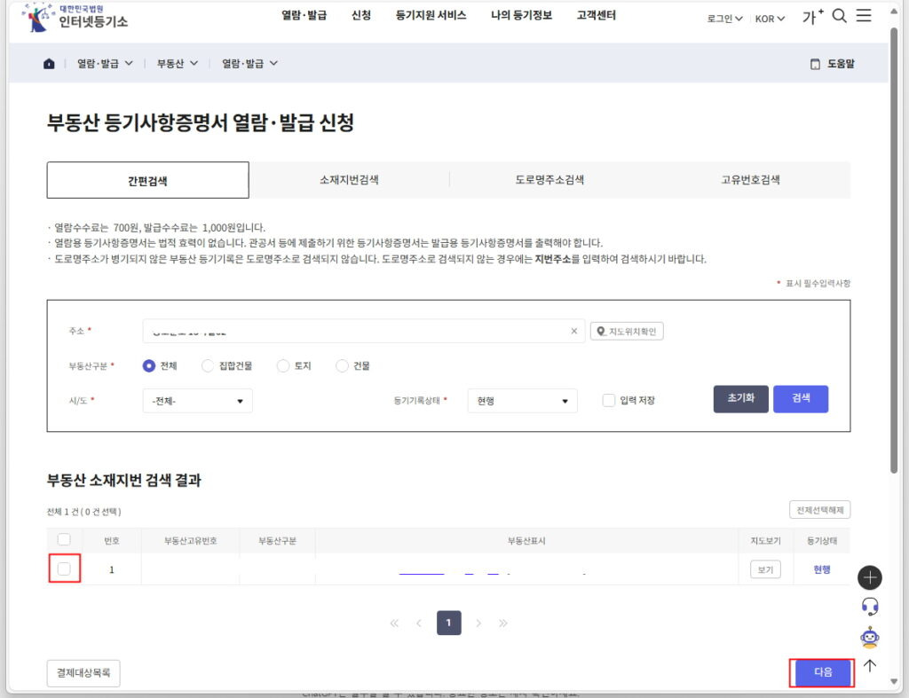 - 검색: 부동산 소재지번 검색결과에 나온 주소를 선택하여 다음 버튼 클릭